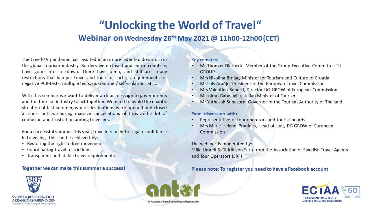 Välkommen till ”Unlocking the World of Travel”, den 26 maj, kl, 11.00-12.00 – ett europeiskt webbinarium i arrangemang av SRF i samarbete med ECTAA och ANTOR. Deltagare är turistministrar, europeiska ledare inom reseindustrin, EU-representanter med flera. Notera att seminariet sker via Facebook, hålls på engelska och är öppet för alla som jobbar med resor och turism. Anmälan sker via denna LÄNK.